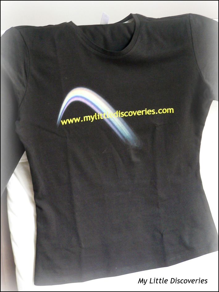 Et comme le hasard fait bien les choses, c'est à ce moment-là que l'on m'a proposé de réaliser un tee-shirt personnalisé sur le site Tunetoo.com! Grâce à l'aide précieuse de May, que je remercie, j'ai donc apposé un visuel My Little Discoveries sur un tee-shirt noir à manches longues ... et voilà le résultat!